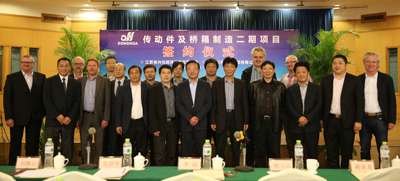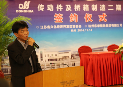 簽約儀式上,董事長宣碧華致辭。他說,東華2007年收購興化齒輪廠,至今已有8年,一直得到了興化市委、市政府和興化開發(fā)區(qū)的大力支持,使一個當(dāng)時不太景氣的企業(yè),得到了新生、發(fā)展。現(xiàn)在不僅是鏈條行業(yè),齒輪、鏈輪、變速箱、橋箱將同步發(fā)展。今天簽約的興化這個項目,我們考慮了東華發(fā)展的增量和存量。增量是我們希望到2020年生產(chǎn)總量翻一番,興化的這個土地就是我們的增量空間。存量有兩塊,一是原來我們在外采購的原材料、零部件,拿回來放在興化生產(chǎn),保證質(zhì)量;二是現(xiàn)在臨平三廠區(qū)制造鏈條要退二進三,騰籠換鳥,把騰出來的廠房做新的項目,比如傳動件超市、輸送機械、CVT變速箱,所以今天我們在這兒舉行簽約儀式,對東華來講是一個很好的發(fā)展機會,具有里程碑意義。