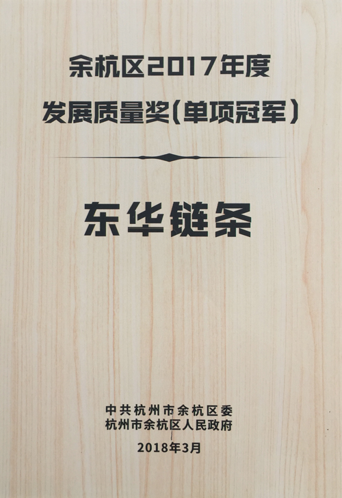 東華鏈條被授予“余杭區(qū)2017年度發(fā)展質(zhì)量獎(單項冠軍)”稱號