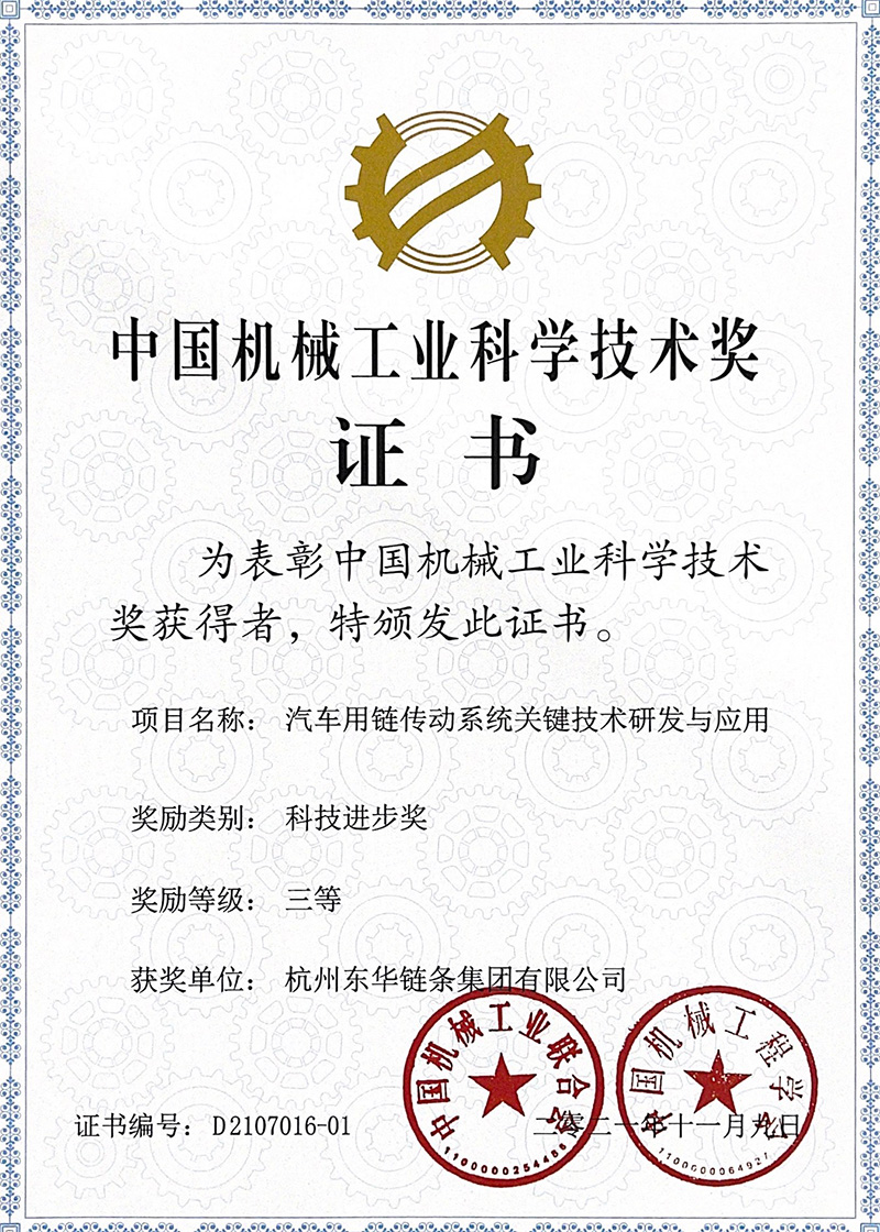日前,東華為主承擔(dān)、武漢某公司參與研發(fā)的“汽車用鏈傳動系統(tǒng)關(guān)鍵技術(shù)研發(fā)及應(yīng)用”高端鏈傳動系統(tǒng)研發(fā)項目獲2021年度中國機械工業(yè)科學(xué)技術(shù)獎科技進步獎三等獎,東華是全國鏈傳動行業(yè)中唯一獲得2021年度中國機械工業(yè)科技大獎的企業(yè)。