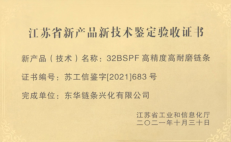日前, 東華鏈條興化公司收到江蘇省工業(yè)和信息化廳頒發(fā)的江蘇省省級工業(yè)新產品新技術驗收證書,公司研制的“32BSPF高精度高耐磨鏈條”產品通過省級工業(yè)新產品鑒定。