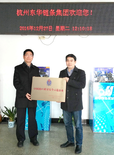 12月27日,杭州出入境檢驗檢疫局檢驗監(jiān)管處何處長與機(jī)械科科長一行赴東華集團(tuán),代表國家質(zhì)檢總局為我集團(tuán)授予“中國出口質(zhì)量安全示范企業(yè)”獎牌。集團(tuán)副總經(jīng)理袁立華等高層參加了授牌儀式。
